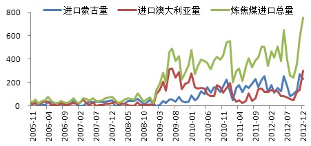 據(jù)悉2012年中鋁進口蒙古焦煤總量約為240萬噸,而1-12月份中國進口焦煤總量達到5354.9萬噸同比增幅16.5%,達到歷史高位,其中進口蒙古焦煤總量為1906萬噸較2011年微降97.9萬噸,考慮2012年四季度進口煤炭量暴漲加之國內(nèi)需求偏弱因此中鋁斷供焦煤暫時對國內(nèi)焦煤市場形成的影響相對有限,而從長期看蒙古煤炭還尚不能失去中國的龐大市場。