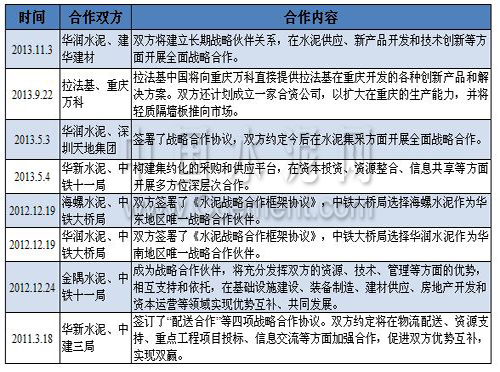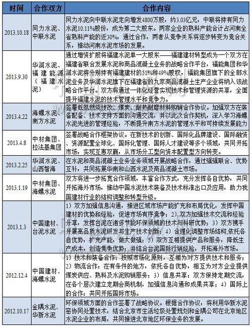 自2012年12月中國(guó)建材集團(tuán)與海螺集團(tuán)兩家行業(yè)內(nèi)的水泥巨頭簽訂了戰(zhàn)略合作協(xié)議之后,到目前為止,圍繞著水泥行業(yè)內(nèi)外的各種戰(zhàn)略合作協(xié)議層出不窮,有水泥企業(yè)之間的戰(zhàn)略合作協(xié)議,也有水泥企業(yè)與下游建工企業(yè)的戰(zhàn)略合作協(xié)議,還有水泥企業(yè)與相關(guān)耗材企業(yè)以及采購(gòu)維修企業(yè)的戰(zhàn)略合作協(xié)議,種類繁多,水泥行業(yè)似乎掀起了一陣戰(zhàn)略合作協(xié)議簽訂的浪潮。