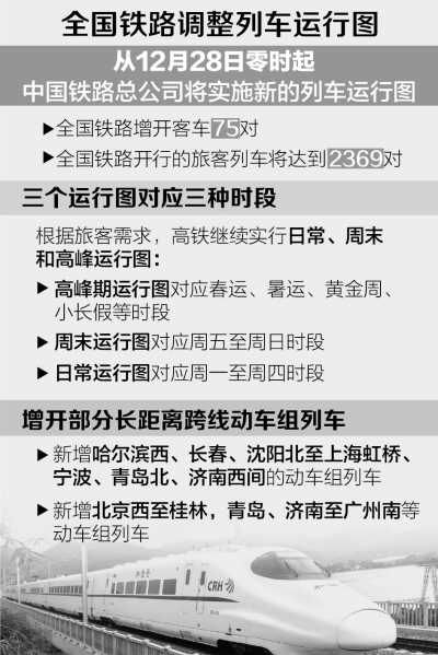 12月16日,中國鐵路總公司對外公布,從12月28日零時起,中國鐵路總公司將實施新的列車運行圖。全國鐵路增開客車75對,鐵路旅客列車將達到2369對,客座能力將從419.4萬增加到433.5萬,增加14萬。