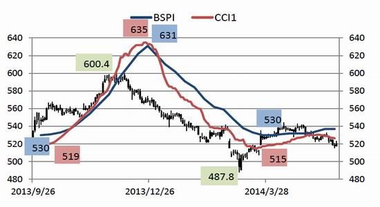 從CCI1指數(shù)來看,該指數(shù)5月份整體波幅也較為有限,從4月下旬開始,指數(shù)由526點(diǎn)上升至530點(diǎn),近期又出現(xiàn)回落,折回526點(diǎn)附近,體現(xiàn)出現(xiàn)貨市場近期扭頭向下,較為低迷。