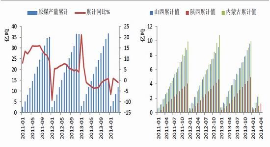 4月國內(nèi)原煤產(chǎn)量 3.01 億噸,環(huán)比減少 400 萬噸,當(dāng)月同比下降 1.3% ,2014年1 - 4月原煤累計產(chǎn)量 11.79 億噸,累計同比下降 1 % 。1 - 4月份的原煤產(chǎn)量數(shù)據(jù)為近幾年以來較低水平。