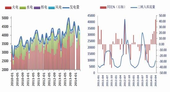 近一個月以來,南方雨水較為充沛,水電對火電的影響成為了市場關(guān)注的熱點(diǎn)。從三峽入庫流量來看,今年4月三峽平均入庫流量9622立方米/秒,同比上漲43.18%,較往年有所提前。從各種發(fā)電方式的占比來看,今年風(fēng)電、核電及其他發(fā)電方式占總發(fā)電量的比例沒有變化,而水電發(fā)電量的提升擠壓了火電市場,今年4月水電發(fā)電量占發(fā)電總量的15%,火電占80%,而去年4月水電占總量的13%,火電占82%。