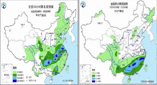 預(yù)計未來10天(5月24日至6月2日),主要降雨區(qū)位于江南、華南,累計降雨量有50-90毫米,部分地區(qū)有100-160毫米,局地可達(dá)180-260毫米。