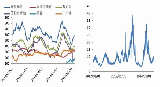 從期貨價格、環(huán)渤海動力煤指數(shù)及CCI1指數(shù)來看,數(shù)據(jù)相關(guān)性較高,且期貨表現(xiàn)出較強(qiáng)的領(lǐng)先性,目前期貨價格向下摸索,CCI1指數(shù)也出現(xiàn)下行跡象,環(huán)渤指數(shù)是否能繼續(xù)堅挺有待觀察。