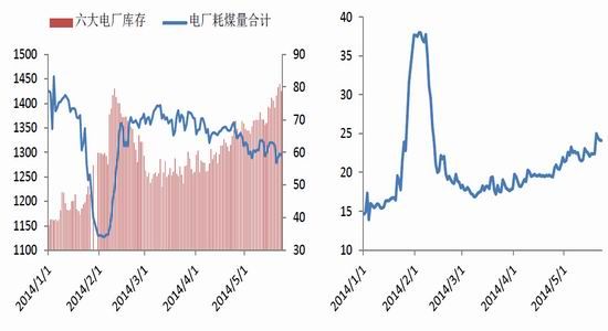 下游電廠庫存本月上升較為明顯,截至5月23日,沿海六大電廠庫存合計1425.3萬噸,同比增漲91.8萬噸,漲幅6.88%,而受制于水電發(fā)電量的增長,電廠日耗煤量不斷下降,截至5月23日,沿海六大電廠日耗煤量總計59.1萬噸,同比下跌9.1萬噸,跌幅13.6%。