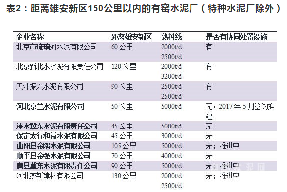 據(jù)公開(kāi)資料,水泥窯協(xié)同處置已經(jīng)形成了以華新(355.62元/噸,0%)、金隅(380元/噸,0%)、海螺(323.12元/噸,0.25%)為代表的三類(lèi)技術(shù)處理類(lèi)型。華新可在水泥廠(chǎng)建預(yù)處理設(shè)施,也可在距離水泥廠(chǎng)外150公里陸運(yùn)范圍內(nèi)建立預(yù)處理廠(chǎng),金隅、海螺一般建在水泥廠(chǎng),以處理周邊城鎮(zhèn)的垃圾為主。綜合來(lái)看,筆者認(rèn)為,雄安新區(qū)垃圾或者污泥的運(yùn)距不宜超過(guò)150公里,。根據(jù)中國(guó)水泥研究院數(shù)據(jù),距離雄安新區(qū)150公里以?xún)?nèi)的具有熟料生產(chǎn)線(xiàn)的水泥廠(chǎng)(特種水泥廠(chǎng)除外)有10家,兩家位于北京市、一家位于天津市,7家位于河北省。其中,北京市的兩家已經(jīng)具有協(xié)同處置能力,基本是處置本市垃圾,雄安新區(qū)的垃圾或污泥運(yùn)送北京市的概率極低;天津振興水泥也建成了污泥示范線(xiàn);河北的7家企業(yè)中尚沒(méi)有協(xié)同處置能力的企業(yè),但是京蘭、曲陽(yáng)金隅、唐縣冀東(320.67元/噸,0.63%)、燕新建材正在推動(dòng)協(xié)同處置項(xiàng)目的上馬,不過(guò)多以協(xié)同處置危險(xiǎn)廢物為主。另外,根據(jù)環(huán)保部《水泥窯協(xié)同處置固體廢物污染防治技術(shù)政策》要求,“新建、改建或擴(kuò)建處置其他固體廢物的水泥企業(yè),應(yīng)選擇單線(xiàn)設(shè)計(jì)熟料生產(chǎn)規(guī)模 3000 噸/日及以上水泥窯”,因而除燕新建材外其余6家企業(yè)均有機(jī)會(huì)。