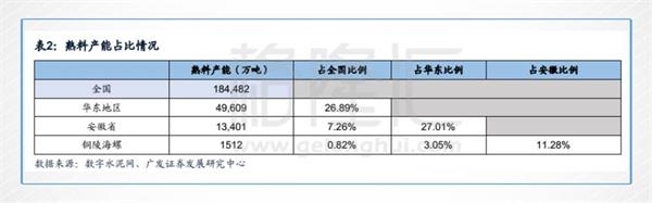 安徽是我國最大的熟料生產(chǎn)基地,2016年時(shí)熟料的產(chǎn)量位居全國的首位,在華東地區(qū)的熟料產(chǎn)能占比也高達(dá)27%。其中,安徽省的主要水泥產(chǎn)能地有銅陵,其熟料產(chǎn)能占全省比例的11%。