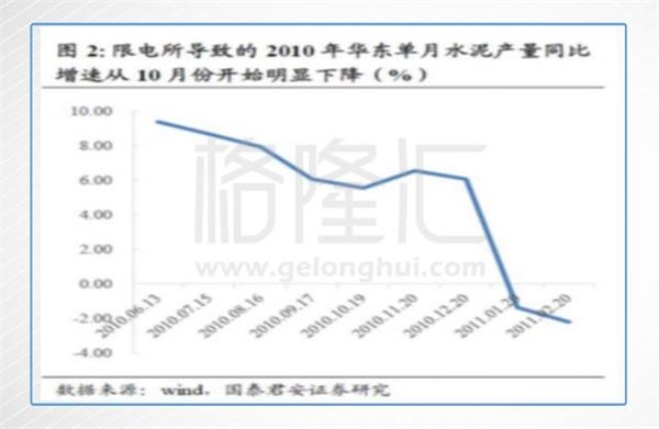 2010年7月至年底,為了完成當(dāng)時(shí)“十一五”的節(jié)能減排目標(biāo),各地陸續(xù)發(fā)布措施以應(yīng)對(duì)節(jié)能減排的考核,拉閘限電是最重要的行政手段。水泥作為耗電的大戶,自然也就成為拉閘首當(dāng)其沖的行業(yè)之一。其中,華東地區(qū)是被限電的最主要區(qū)域。上圖是2010年華東區(qū)的熟料產(chǎn)量數(shù)據(jù),可以看到限電期間產(chǎn)量增速下滑明顯。