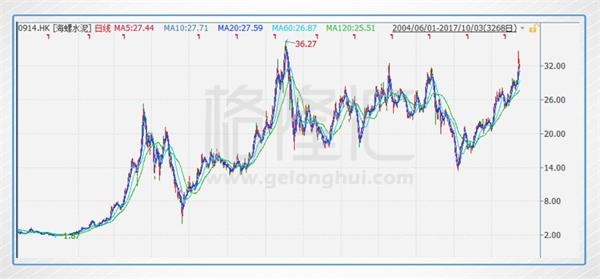 同樣是在2010下半年,海螺水泥的H股股價(jià)達(dá)到歷史峰值,36.27港元。