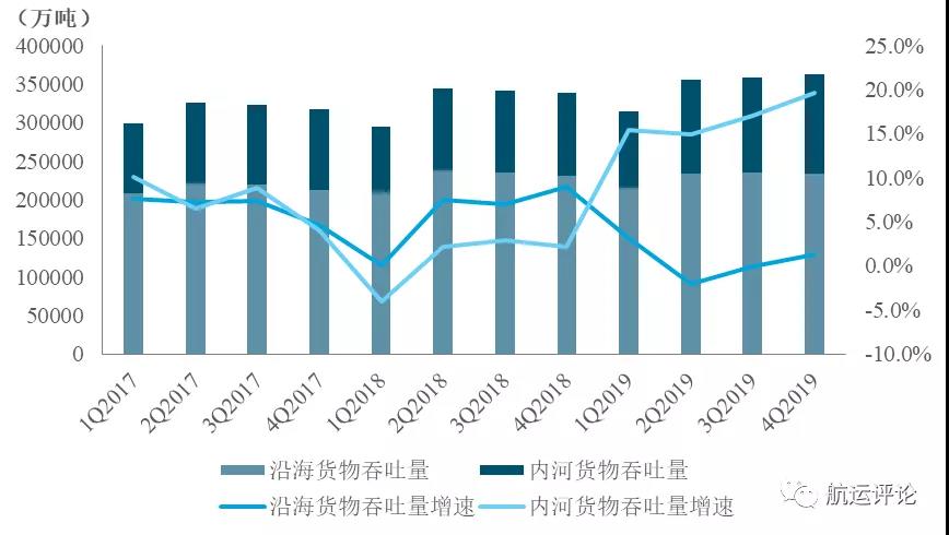 內(nèi)需提振中國內(nèi)河港口貨物吞吐量大幅增長2019年,中國面臨的經(jīng)貿(mào)環(huán)境不容樂觀,GDP實際增速預計為6.1%,為1992年有統(tǒng)計數(shù)據(jù)以來的年度最低值;外貿(mào)進出口總值31.54萬億元人民幣,同比增長3.4%,與去年9.7%的增速相比放緩明顯。但中國國內(nèi)需求穩(wěn)步擴大,前11個月中國社會消費品零售總額同比增長8%,中國消費正在高基數(shù)的基礎上加快增長。在此背景下,中國港口貨物吞吐量總體保持較快增長,內(nèi)需提振內(nèi)河港口貨物吞吐量增長強勁,成為推動中國港口貨物吞吐量增長的主要動力。