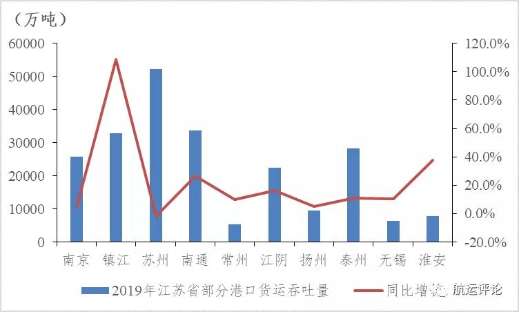 2019年中國內(nèi)河港口貨物吞吐量表現(xiàn)強勁,全國港口完成貨物吞吐量47.6億噸,同比增長19.4%,與去年增速相比大幅增長。自2019年一季度起,中國內(nèi)河港口吞吐量就保持15%以上的強勁增速,主要由于長江內(nèi)河對“黑碼頭”的整治,貨源集中至長江沿線大港,促進港口吞吐量大幅上漲。江蘇省是全國內(nèi)河港口大省,內(nèi)河港口貨物吞吐量約占全國的53%,隨著江蘇省港口資源整合的進一步推進,以南京港、蘇州港為首的江蘇省港口群不斷強化營銷網(wǎng)絡、優(yōu)化航線布局,進一步釋放一體化改革紅利,2019年江蘇省港口內(nèi)河貨物吞吐量得以大幅增長,完成貨物吞吐量25億噸,同比增長18%。其中,鎮(zhèn)江港港口貨物吞吐量增速與去年相比翻番,主要由于今年基建、房地產(chǎn)投資增速漲勢良好,鎮(zhèn)江港礦物性建筑材料實現(xiàn)大幅增長,提振港口貨物吞吐量上漲。