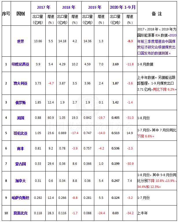 2020年前三季度全球主要煤炭出口國(guó)出口變化情況