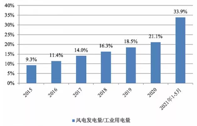 圖 2 東北地區(qū)風(fēng)電發(fā)電量占工業(yè)用電比重(上圖)和風(fēng)電發(fā)電量(億kWh)變化趨勢(下圖)