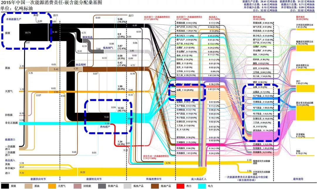為了理解能源與經(jīng)濟(jì)的供需銜接關(guān)系,可以用我們的最新學(xué)術(shù)成果來進(jìn)行解釋。圖4是我所指導(dǎo)的章景皓(Chong Chin Hao)博士的博士論文中的一張“我國嵌含能分配;鶊D”,也是我們所出品的最復(fù)雜的一張能源;鶊D。圖的左半邊是能源供應(yīng)的部分,從各種的一次能源來源到轉(zhuǎn)化、再到各個終端用能部門。右邊我們嘗試應(yīng)用嵌含能的理論和方法,把一次能耗責(zé)任在經(jīng)濟(jì)內(nèi)部的復(fù)雜投入產(chǎn)出關(guān)系給揭示出來,從耗能商品到最終商品、再到最終使用,聯(lián)系到了驅(qū)動經(jīng)濟(jì)的三駕馬車:本地消費(fèi)、凈出口和固定資本形成。這樣,從圖的最右邊到最左邊,就可以理解從經(jīng)濟(jì)增長到產(chǎn)業(yè)耗能再到一次能源需求的整個貫通過程。其中的主要特點(diǎn)(2015年數(shù)據(jù),重點(diǎn)已圈出)包括:
