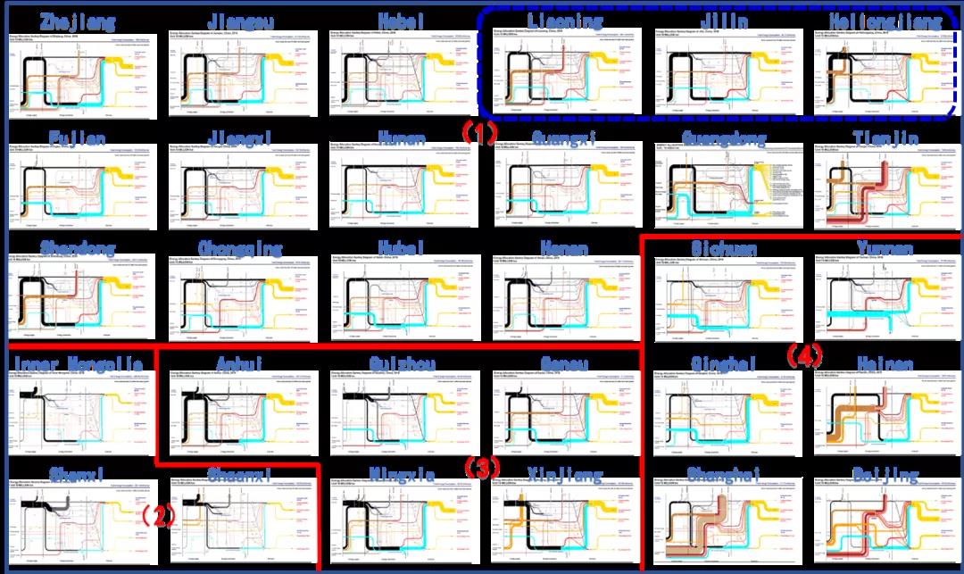 因為行政管理分割的問題,各個區(qū)域在能源供需上存在各自優(yōu)化現(xiàn)象,很多時候并不能做到全國一盤棋的理想性優(yōu)化調(diào)度。區(qū)域間的能源互通基礎(chǔ)設(shè)施也是不足的,需要在低碳發(fā)展要求下加強(qiáng)建設(shè)。一旦出現(xiàn)緊急事件,基本以自救和已經(jīng)建立的通道進(jìn)行跨區(qū)域協(xié)調(diào)為主,而且也跟區(qū)域的全國位勢有關(guān)。這樣,在區(qū)域協(xié)調(diào)方面東北有可能處于一個被忽視的地位,也缺乏跨區(qū)域通道。圖5是我們繪制的2016年各省份能源分配;鶊D,可以看到東三省在右上角。其能源供需的主要特點(diǎn)是:除了石油產(chǎn)品方面和外部有較強(qiáng)的互通外,煤炭和電力基本是自給自足的,所以和外部的互通能力應(yīng)該不足。一旦出了事故,因為跟外界的能源通路不夠,容易導(dǎo)致應(yīng)急調(diào)度能力存在限制。國家的區(qū)域戰(zhàn)略也是以強(qiáng)調(diào)某片區(qū)域為主,跨大區(qū)域的大規(guī)模協(xié)調(diào)目前應(yīng)該不但缺乏基礎(chǔ)設(shè)施布局,也缺乏體制機(jī)制的保障。