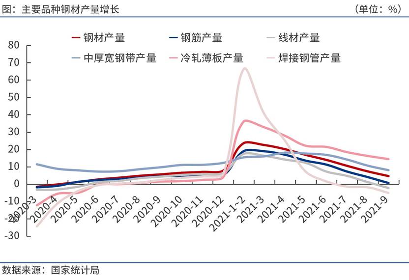 按鋼材品種來(lái)看,20211-9月份,我國(guó)鋼材產(chǎn)量10.2億噸,同比增長(zhǎng)4.6%。其中,鋼筋產(chǎn)量1.95億噸,同比增長(zhǎng)0.6%;線材產(chǎn)量1.21億噸,同比下降2.3%;冷軋薄板產(chǎn)量3245.1萬(wàn)噸,同比增長(zhǎng)14.4%;中厚寬鋼帶產(chǎn)量1.38億噸,同比增長(zhǎng)8.0%;焊接鋼管產(chǎn)量4366.1萬(wàn)噸,同比下降5.1%。