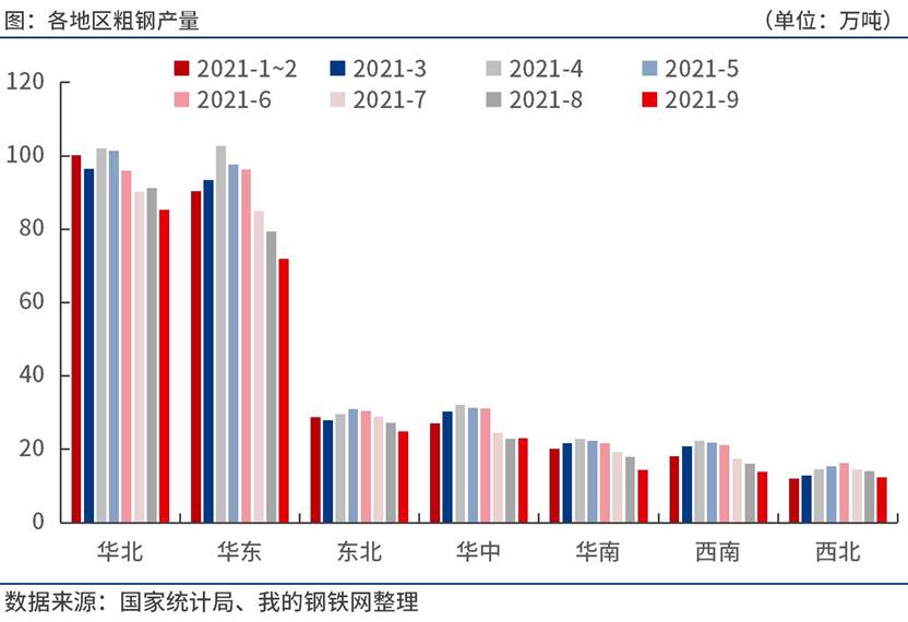 按地區(qū)來(lái)看,20211-9月份,華北地區(qū)粗鋼產(chǎn)量2.64億噸,同比下降5.0%;華東地區(qū)粗鋼產(chǎn)量2.45億噸,同比增長(zhǎng)3.0%;東北地區(qū)粗鋼產(chǎn)量7856萬(wàn)噸,同比增長(zhǎng)4.5%;華中地區(qū)粗鋼產(chǎn)量7595.9萬(wàn)噸,同比增長(zhǎng)7.7%;華南地區(qū)粗鋼產(chǎn)量5386萬(wàn)噸,同比增長(zhǎng)32.8%;西南地區(qū)粗鋼產(chǎn)量5057萬(wàn)噸,同比增長(zhǎng)8.2%;西北地區(qū)粗鋼產(chǎn)量3824萬(wàn)噸,同比增長(zhǎng)15.7%。