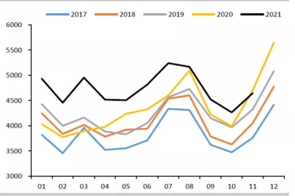 全國(guó)火電月度發(fā)電量走勢(shì)情況(單位:億千瓦時(shí))