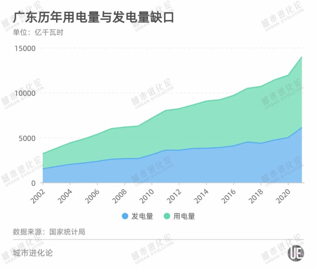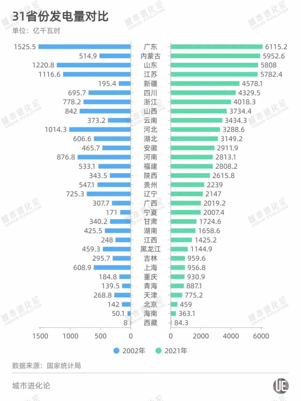 數(shù)據(jù)顯示,2002年,廣東的發(fā)電量全國第一,為1525.5億千瓦時,與云貴川三省發(fā)電量總和(1616億千瓦時)相差不大;到了2021年,廣東以6115.2億千瓦時發(fā)電量排名全國第一,而云貴川三省發(fā)電量已增至10002.8億千瓦時。