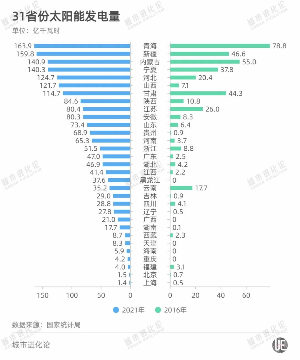 同年,太陽能發(fā)電量的前八名無一例外均被三北地區(qū)省份包攬,除青海居于第一外,新疆、內(nèi)蒙古再次進入前三。