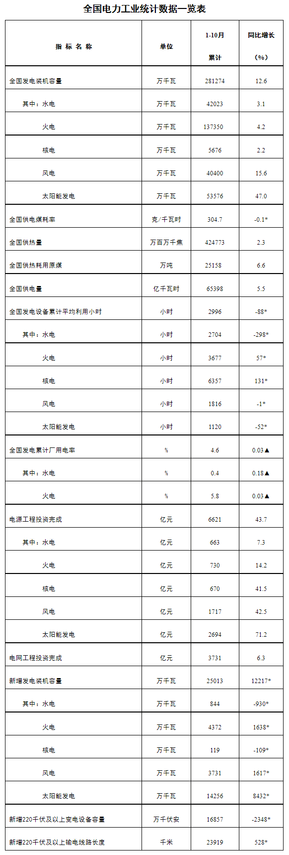 11月20日,國家能源局發(fā)布1-10月份全國電力工業(yè)統(tǒng)計(jì)數(shù)據(jù)。