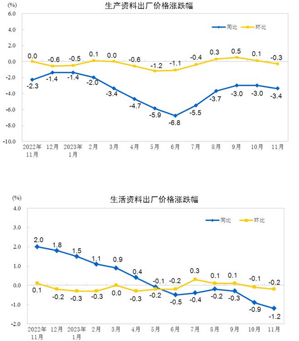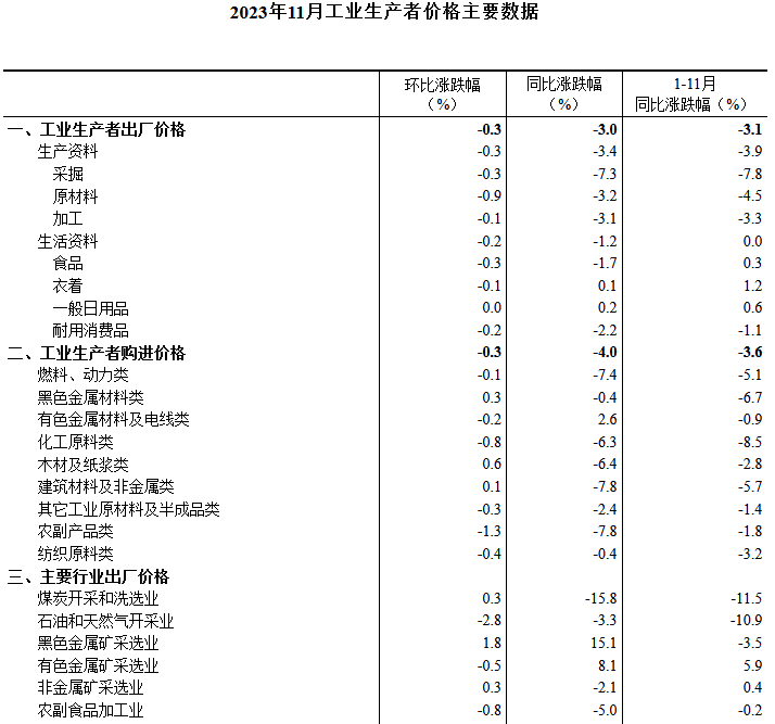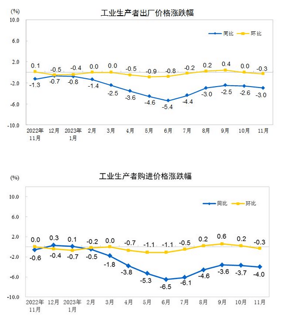 2023年11月份,全國工業(yè)生產(chǎn)者出廠價(jià)格同比下降3.0%,環(huán)比下降0.3%;工業(yè)生產(chǎn)者購進(jìn)價(jià)格同比下降4.0%,環(huán)比下降0.3%。1—11月平均,工業(yè)生產(chǎn)者出廠價(jià)格比上年同期下降3.1%,工業(yè)生產(chǎn)者購進(jìn)價(jià)格下降3.6%。