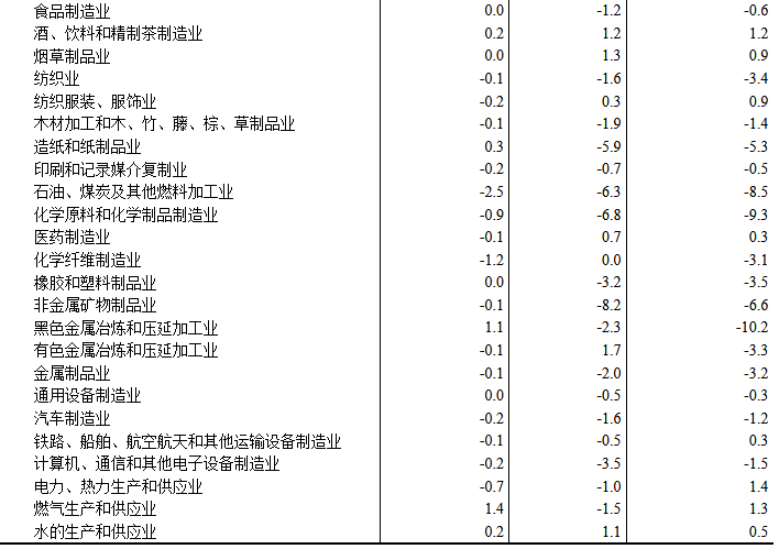 工業(yè)生產(chǎn)者購進(jìn)價(jià)格中,農(nóng)副產(chǎn)品類價(jià)格下降1.3%,化工原料類價(jià)格下降0.8%,有色金屬材料及電線類價(jià)格下降0.2%,燃料動(dòng)力類價(jià)格下降0.1%;黑色金屬材料類價(jià)格上漲0.3%,建筑材料及非金屬類價(jià)格上漲0.1%。