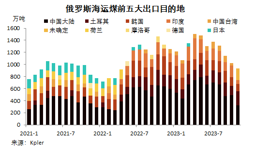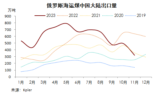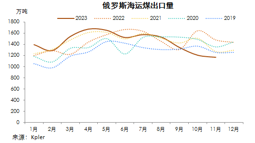Kpler船舶追蹤數(shù)據(jù)顯示,2023年11月份,俄羅斯海運(yùn)煤出口量1168.73萬噸,環(huán)比降3.10%,連續(xù)第四月環(huán)比下降,同比降21.02%。