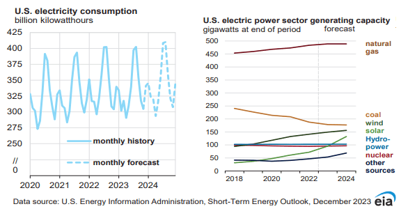 而隨著經(jīng)濟(jì)增長(zhǎng)加速,2024年,美國(guó)電力需求預(yù)計(jì)將再次增加至41030億千瓦時(shí),低于前一月預(yù)期值41160億千瓦時(shí)。
