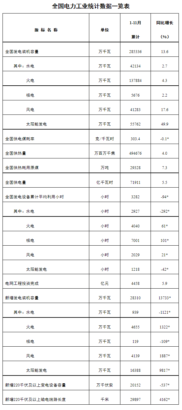 12月20日,國(guó)家能源局發(fā)布1-11月份全國(guó)電力工業(yè)統(tǒng)計(jì)數(shù)據(jù)。