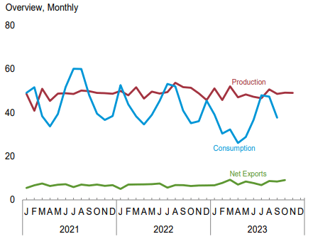 12月21日,美國能源信息署(EIA)發(fā)布最新《月度能源回顧》顯示,2023年11月份,美國煤炭產(chǎn)量為4895.1萬短噸(4440.76萬噸),較上年同期的4875.4萬短噸微增0.4%,較前一月的4907.4萬短噸下降0.25%。