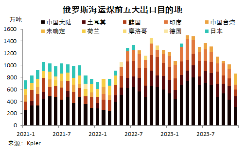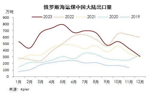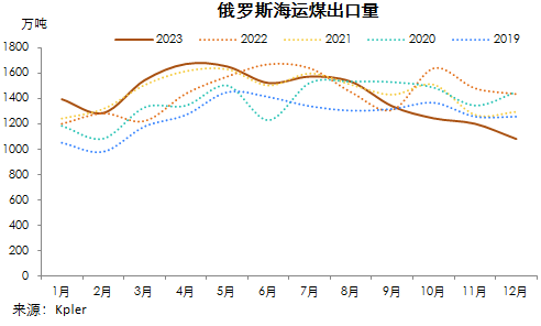 Kpler船舶追蹤數(shù)據(jù)顯示,2023年12月份,俄羅斯海運(yùn)煤出口量1082.13萬(wàn)噸,環(huán)比降9.97%,連續(xù)第五月環(huán)比下降,同比降24.62%。
