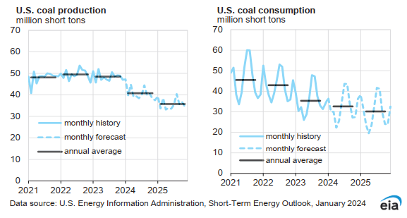 1月9日,美國(guó)能源信息署(EIA)發(fā)布最新《短期能源展望》報(bào)告顯示,2024年,美國(guó)煤炭產(chǎn)量預(yù)計(jì)較2023年的5.817億噸下降14.34%,至4.893億短噸(4.44億噸)。