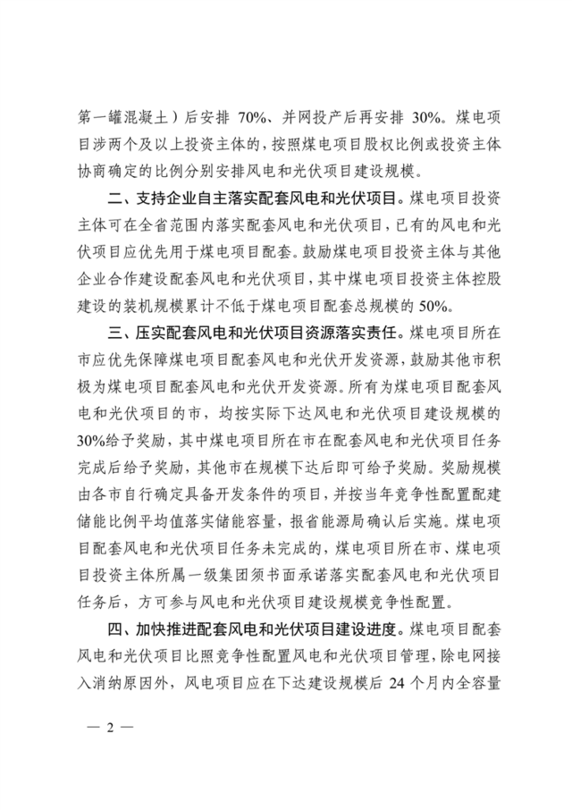 所有為煤電項(xiàng)目配套風(fēng)電和光伏項(xiàng)目的市,均按實(shí)際下達(dá)風(fēng)電和光伏項(xiàng)目建設(shè)規(guī)模的30%給予獎(jiǎng)勵(lì)。