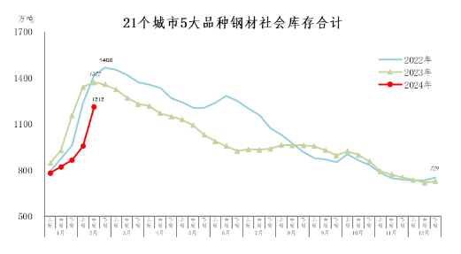2月中旬,21個(gè)城市5大品種鋼材社會(huì)庫(kù)存1212萬(wàn)噸,環(huán)比增加256萬(wàn)噸,上升26.8%,庫(kù)存大幅上升;比年初增加483萬(wàn)噸,上升66.3%;比上年同期減少160萬(wàn)噸,下降11.7%。