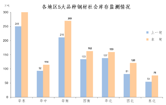 2月中旬,分地區(qū)來(lái)看,七大區(qū)域庫(kù)存環(huán)比均有所上升,具體情況為:華東庫(kù)存環(huán)比增加63萬(wàn)噸,上升25.3%,為增量最大地區(qū);華南增加59萬(wàn)噸,上升28.1%;西北增加39萬(wàn)噸,上升48.1%,為增幅最大地區(qū);東北增加22萬(wàn)噸,上升40.7%;華北增加22萬(wàn)噸,上升16.1%;華中增加22萬(wàn)噸,上升23.9%;西南增加29萬(wàn)噸,上升21.8%。