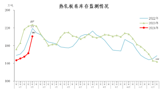 2月中旬,熱軋板卷庫(kù)存201萬(wàn)噸,環(huán)比增加38萬(wàn)噸,上升23.3%,庫(kù)存連續(xù)5旬上升;比年初增加57萬(wàn)噸,上升39.6%;比上年同期減少26萬(wàn)噸,下降11.5%。