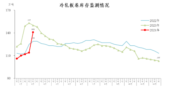 2月中旬,冷軋板卷庫(kù)存141萬(wàn)噸,環(huán)比增加27萬(wàn)噸,上升23.7%,庫(kù)存大幅上升;比年初增加38萬(wàn)噸,上升36.9%;比上年同期減少9萬(wàn)噸,下降6.0%。