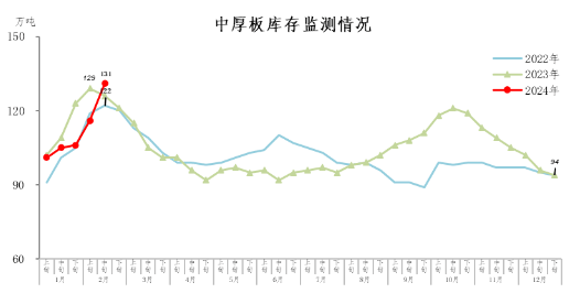 2月中旬,中厚板庫(kù)存131萬(wàn)噸,環(huán)比增加15萬(wàn)噸,上升12.9%,庫(kù)存升幅繼續(xù)擴(kuò)大;比年初增加37萬(wàn)噸,上升39.4%;比上年同期增加5萬(wàn)噸,上升4.0%。