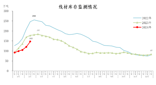 2月中旬,線材庫(kù)存147萬(wàn)噸,環(huán)比增加27萬(wàn)噸,上升22.5%,庫(kù)存連續(xù)7旬上升;比年初增加64萬(wàn)噸,上升77.1%;比上年同期減少31萬(wàn)噸,下降17.4%。