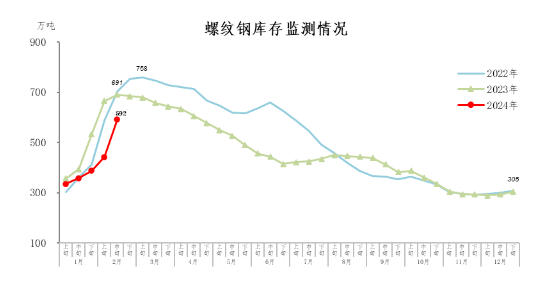 2月中旬,螺紋鋼庫(kù)存592萬(wàn)噸,環(huán)比增加149萬(wàn)噸,上升33.6%,庫(kù)存連續(xù)7旬上升,升幅繼續(xù)擴(kuò)大;比年初增加287萬(wàn)噸,上升94.1%;比上年同期減少99萬(wàn)噸,下降14.3%。