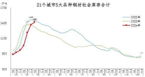 3月上旬,21個(gè)城市5大品種鋼材社會(huì)庫(kù)存1422萬(wàn)噸,環(huán)比增加55萬(wàn)噸,上升4.0%,庫(kù)存上升幅度回落;比年初增加693萬(wàn)噸,上升95.1%;比上年同期增加97萬(wàn)噸,上升7.3%。