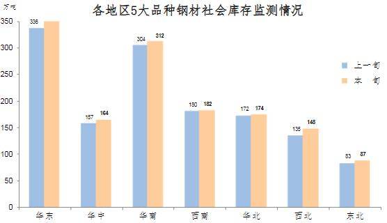 3月上旬,分地區(qū)來看,七大區(qū)域庫(kù)存環(huán)比繼續(xù)上升,具體情況為:華東庫(kù)存環(huán)比增加19萬(wàn)噸,上升5.7%,為增量最大地區(qū);西北增加13萬(wàn)噸,上升9.6%,為升幅最大地區(qū);華南增加8萬(wàn)噸,上升2.6%;華中增加7萬(wàn)噸,上升4.5%;東北增加4萬(wàn)噸,上升4.8%;華北增加2萬(wàn)噸,上升1.2%;西南增加2萬(wàn)噸,上升1.1%。