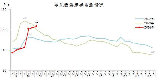 3月上旬,冷軋板卷庫(kù)存145萬(wàn)噸,環(huán)比增加2萬(wàn)噸,上升1.4%,庫(kù)存小幅上升;比年初增加42萬(wàn)噸,上升40.8%;比上年同期增加5萬(wàn)噸,上升3.6%。