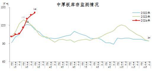 3月上旬,中厚板庫(kù)存141萬(wàn)噸,環(huán)比增加4萬(wàn)噸,上升2.9%,庫(kù)存連續(xù)上升;比年初增加47萬(wàn)噸,上升50.0%;比上年同期增加26萬(wàn)噸,上升22.6%。