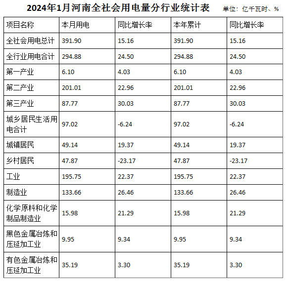 國(guó)家能源局河南監(jiān)管辦公室3月15日發(fā)布數(shù)據(jù)顯示,2024年1月,河南省全省全社會(huì)用電量391.90億千瓦時(shí),同比增加15.16%。
