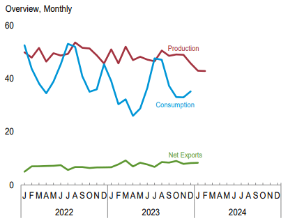 消費(fèi)方面,報(bào)告顯示,2023年12月份,美國(guó)煤炭總消費(fèi)量為3526.2萬(wàn)短噸,同比下降22.32%,環(huán)比增長(zhǎng)6.87%。