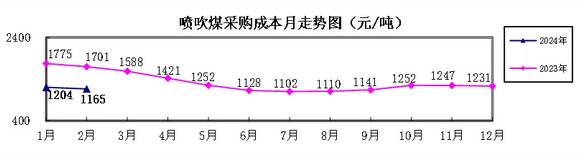 噴吹煤2月份加權(quán)平均折算成干基的采購(gòu)成本為1164.74元/噸,環(huán)比下降39.66元/噸,降幅為3.29%。1-2月累計(jì)平均折算成干基的采購(gòu)成本為1181.73元/噸,同比下降560.43元/噸,降幅為32.17%。