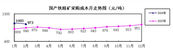 國(guó)產(chǎn)鐵精礦(干基)2月份加權(quán)平均采購(gòu)成本為972.65元/噸,環(huán)比下降29.88元/噸,降幅為2.98%。1-2月累計(jì)平均采購(gòu)成本為990.06元/噸,同比升高159.56元/噸,升幅為19.21%。