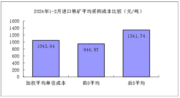 進(jìn)口粉礦2月份加權(quán)平均采購(gòu)成本980.04元/噸,環(huán)比下降32.41元/噸,降幅為3.20%。1-2月累計(jì)平均采購(gòu)成本為990.39元/噸,同比升高139.04元/噸,升幅為16.33%。